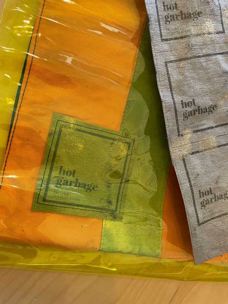 - Bottom middle: A larger different type of sew-on label, but with these I treated with some additional ink and paint to truly reflect the idea of the “hot garbage” branding” in which everything was hot garbage (more on that maybe sometime never)